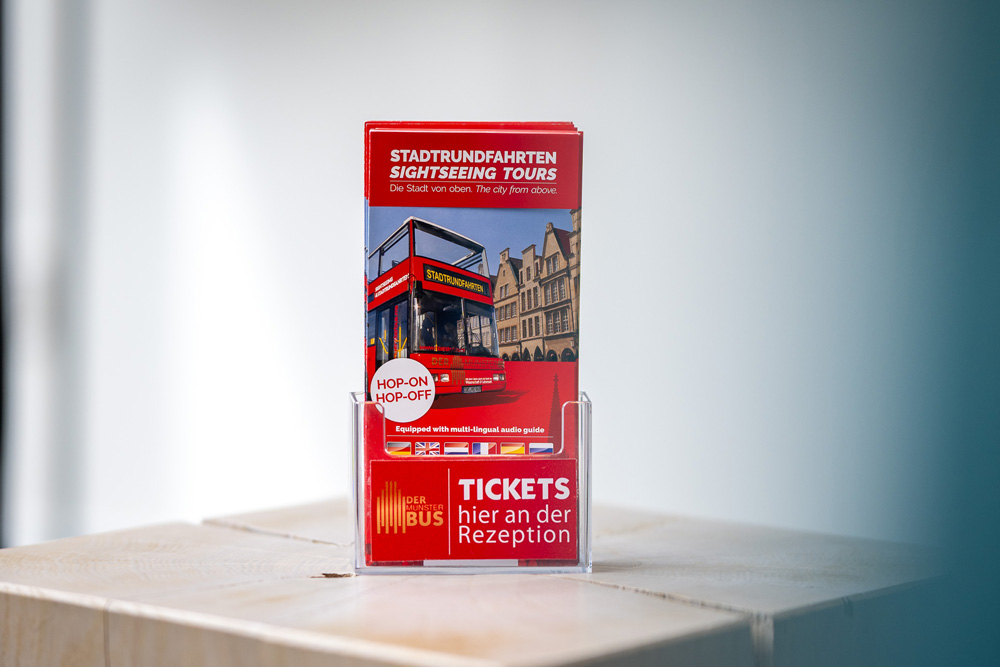 Discover Münster in comfort and at your own pace with the MünsterBus. Sit back and enjoy the ride through the historic city centre. You’ll experience a city tour with a difference, complete with hop-on, hop-off stops. Tickets are available at our reception.